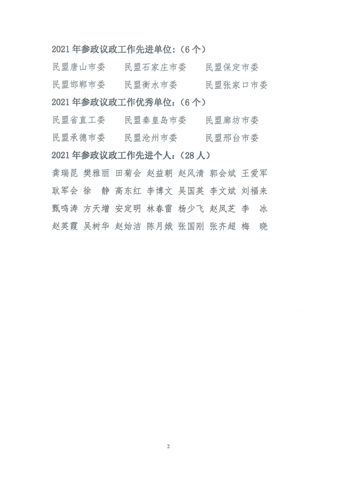 2022年5月18日,民盟省委反饋:民盟張家口市委榮獲民盟河北省委2021年參政議政工作先進單位、反映社情民意信息先進集體二等獎;安定明榮獲參政議政工作先進個人,師曉紅、張旭鳳榮獲反映社情民意信息先進個人。