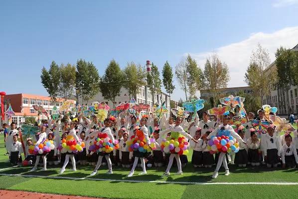 時代少年課間操,紅白相間是傘舞。紅鼓紅衣有腰鼓,手托蠟燭世間愛。韻律動感曳步舞,“繩”彩飛揚展陽光。綠茵場地黑白間,小小足球大夢想。氣球風箏小飛機,追逐夢想我先行。